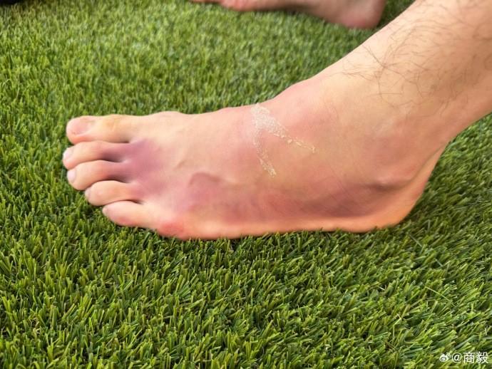 赛后,商竣程的父亲商毅在社交媒体上晒出了儿子的伤脚,脚上的淤青明显,有充血的症状。